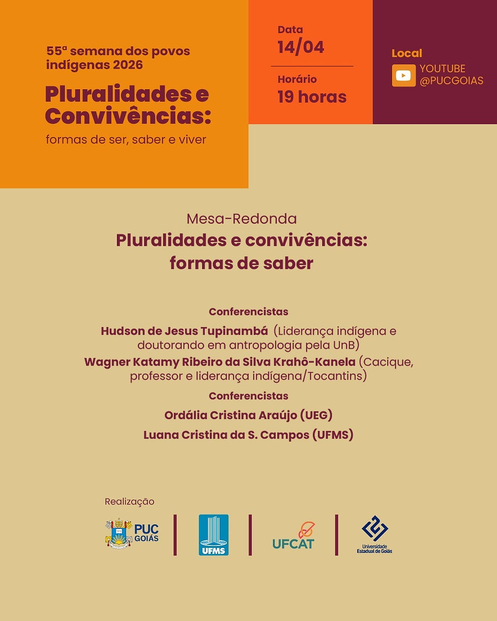 A 55ª Semana dos Povos Indígenas da Pontifícia Universidade Católica de Goiás (PUC Goiás) segue com programação até o dia 17 de abril de 2026, reunindo conferências, mesas-redondas, atividades culturais e debates voltados à valorização dos povos originários e à ampliação do diálogo intercultural no ambiente acadêmico.