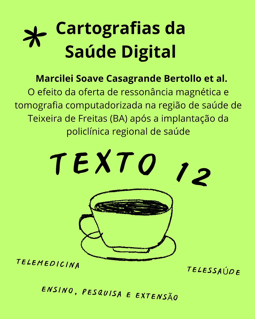 BERTOLLO, Marcilei Soave Casagrande et al. O efeito da oferta de ressonância magnética e tomografia computadorizada na região de saúde de Teixeira de Freitas (BA) após a implantação da policlínica regional de saúde. In: VALENTIM, Janaína Luana Rodrigues da Silva et al. (orgs.). Experiências de Saúde Digital no Brasil. Natal: Sedis-UFRN, 2024. p. 51-79. Disponível em: https://repositorio.ufrn.br/handle/123456789/62884.